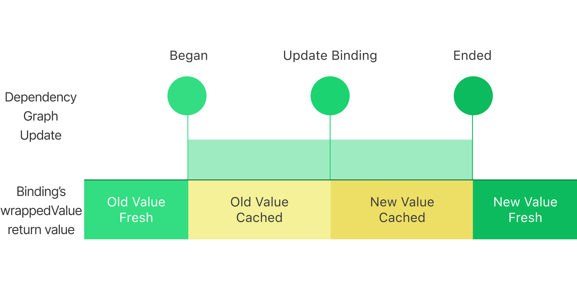 由于我的同事使用的是函数式 Binding 而不是从 State 投影的 Binding ,你可能直觉上会认为函数式 Binding 的 wrappedValue 会直接返回在 Binding 实例化中使用的 get 闭包的结果。这可以用以下伪代码表示。 let transaction : Transaction let setter : ( Value , Transaction ) -> Void var wrappedValue : Value { setter ( newValue , transaction ) 但这是面向实现的思维--首先你知道了这个 Binding 的底层实现,然后根据底层实现的事实推断出了这种行为。 要理解上述示例中我们观察到的 Binding 上 bug 一样的行为,我们必须更加深入地了解 Binding 。 在 SwiftUI 中, Binding 具有特殊的意义-- Binding 是 SwiftUI 中受管理动态数据的「引用」。这里的「受管理动态数据」是指能够投影 Binding 的 dynamic property。SwiftUI 的文档称这些 dynamic property 为「真相源 (Source of Truth)」。这一点可以从 iOS 16 SDK 中随附文档中 Binding 的部分得到验证: A property wrapper type that can read and write a value owned by a source of truth. 但是我认为「受管理动态数据」是一个更不容易引发歧义的称呼,因为你必须先让这些 dynamic property 被 SwiftUI 管理了,然后它们才能按照你的期望工作。为了让这些 dynamic property 被 SwiftUI 管理起来,你必须直接将它们安装在 SwiftUI 提供的 View , Gesture 或其他用户界面结构类型上: struct ContentView : View { 因此,我们可以知道, Model.Item 里面第一个问题是 Model.Item 的 Binding 属性没有被直接安装在 View 上。 另一方面,由于 Binding 被设计为 受管理动态数据 的引用,并且 SwiftUI 实现了事务更新模式来让这些数据在 dependency graph 更新期间保持一致性,因此 Binding 也会遵循这个事务更新模式。更详细的说, Binding : 在初始化时以及 dependency graph 更新它时缓存最新值 当 dependency graph 更新时,返回缓存值