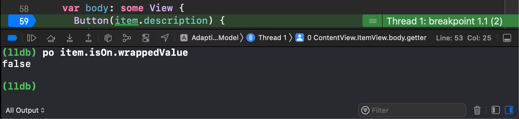 SwiftUI 会随着值的更新而更新。由于 Model.Item 中没有存储属性的改变(都是 let 属性),因此 SwiftUI 无法检测 Binding 背后的变化。 class Model : ObservableObject { 我们可以通过在设置断点的情况下运行程序来验证这一点。 在调用 self.objectWillChange.send() 之后, ItemView.body 将不会被求值。 为了帮助我的同事赶上他的截止日期,以最少的力气解决这个问题,我建议我的同事将他投喂给 SwiftUI 的 Model 像下面这样扩充一下: class Model : ObservableObject { 然后,他就可以在调用 self.objectWillChange.send() 时通过增加 Model.Item.seed 的值来驱动 SwiftUI 对 ItemView.body 进行求值了: class Model : ObservableObject { } set : { newValue , tnx in LegecyModel . shared . setOn ( newValue ) { DispatchQueue . main . async { self . objectWillChange . send ( ) struct ContentView : View { Button ( item . description ) { . buttonStyle ( BySeedUpdateToggleButtonStyle ( isOn : item . isOn . wrappedValue , seed : item . seed ) ) struct BySeedUpdateToggleButtonStyle : ButtonStyle { func makeBody ( configuration : Configuration ) -> some View { Toggle ( isOn : . constant ( isOn ) ) { . contentShape ( Rectangle ( ) ) 在他修改了代码、编译并运行了程序后,我们期待着奇迹发生——但最终没有任何改变。他仍然无法通过点击「OK」按钮来让打开开关。 但是现在 SwiftUI 会开始对 ItemView.body 进行求值了。 修改二:理解 Dynamic Property 更新 通过在他的代码中设置断点我们可以发现,即使我们通过增加 Model.Item.seed 的值来强制要求 SwiftUI 对 ItemView.body 进行求值, Binding 的 wrappedValue 也不会改变。