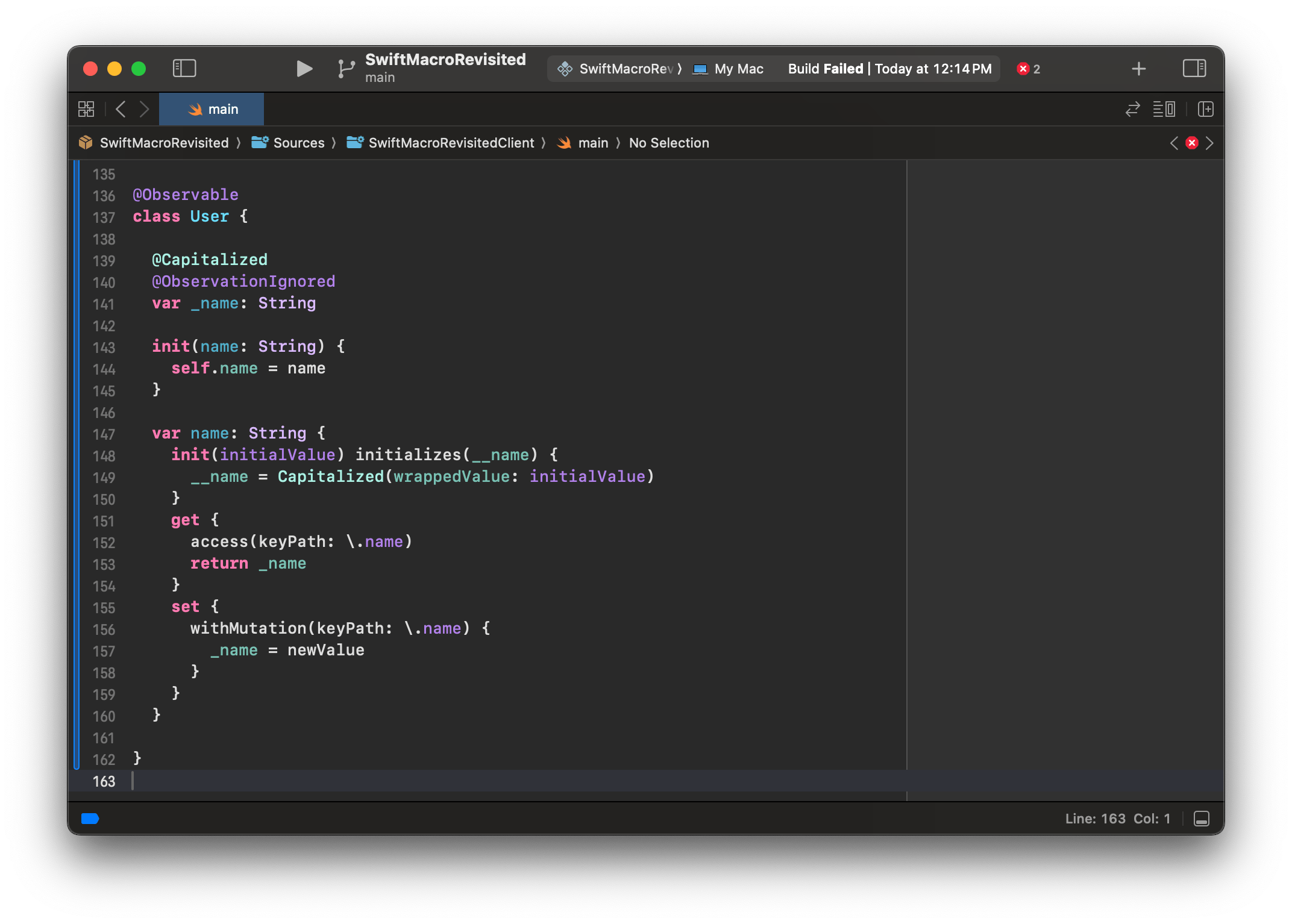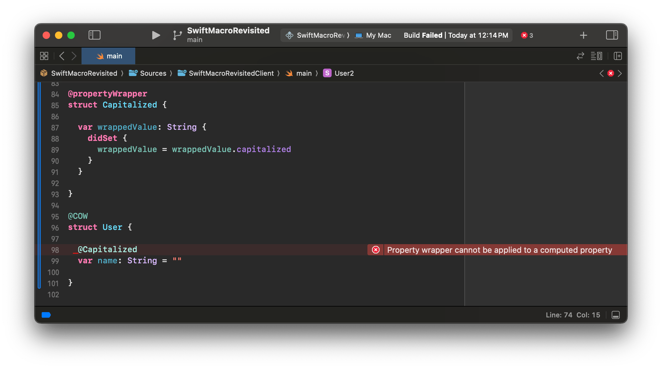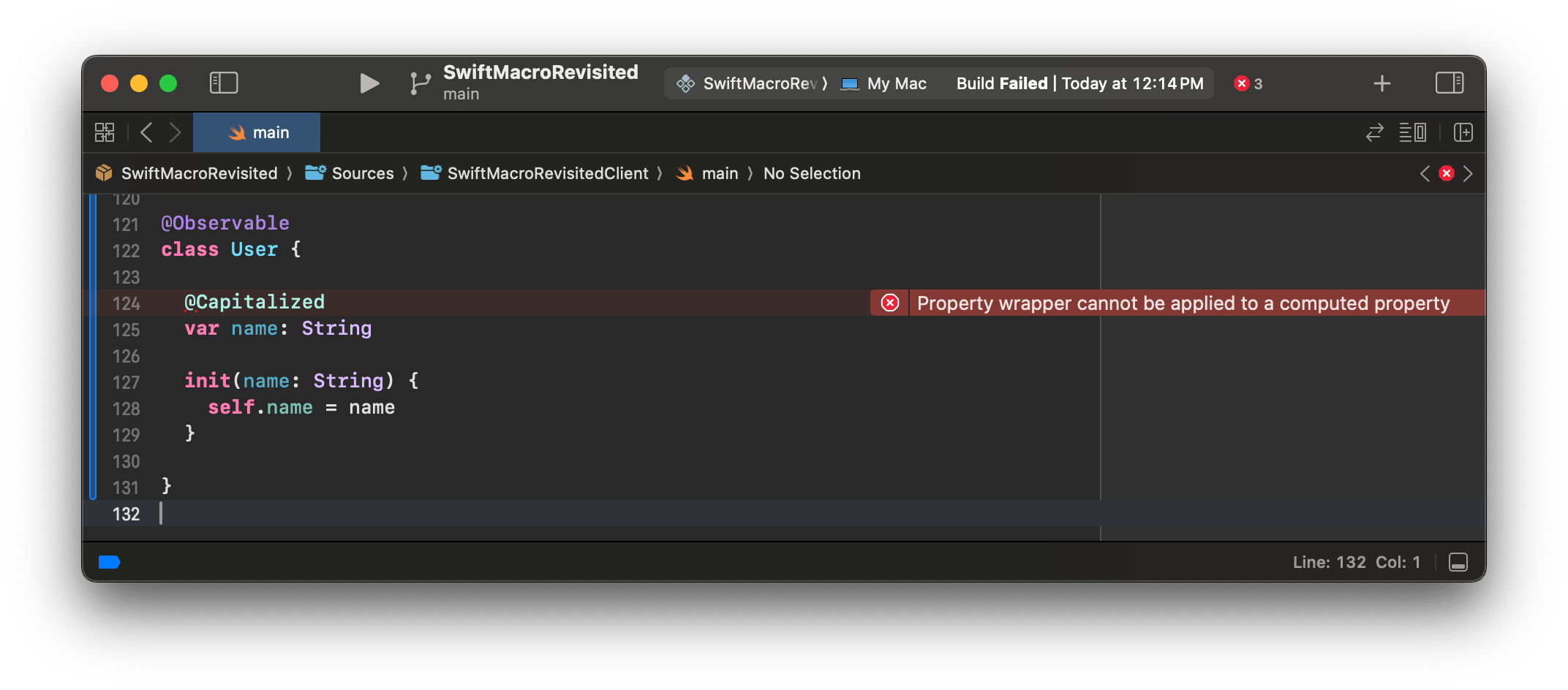 我们得到这个展开结果是因为 property wrapper 的「展开」发生在宏展开之后。根据这个结果,@Capitalized property wrapper 仍然附着在 name 变量上,但由于宏展开,变量从存储属性变成了计算属性。最终,我们会得到编译器诊断出来的错误: