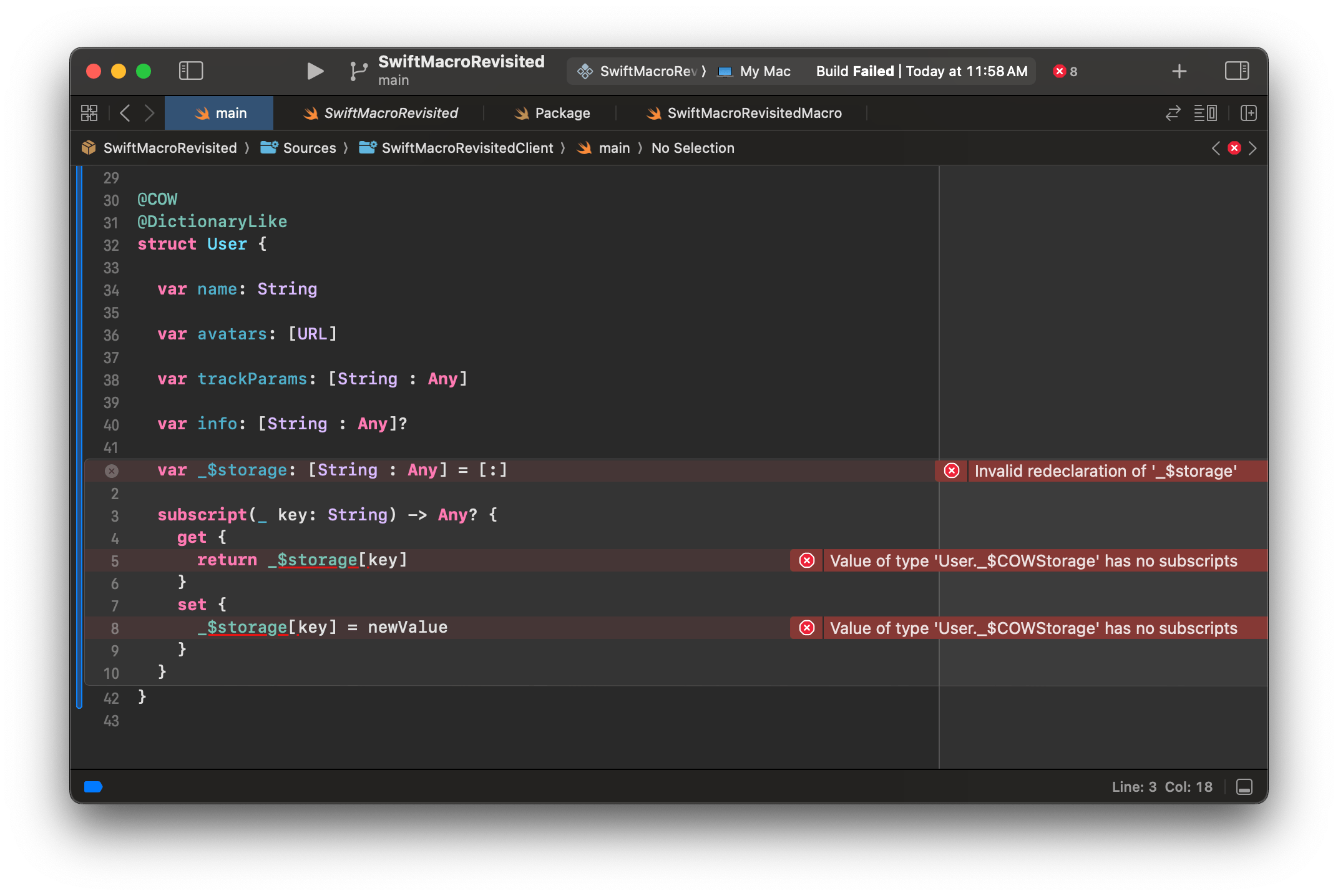 swift12345678910111213@COW@DictionaryLikestruct User { // 其他内容 ... // 由 @COW 宏展开引入 var _$storage: Storage // 由 @DictionaryLike 宏展开引入 var _$storage: [String : Any] = [:]}