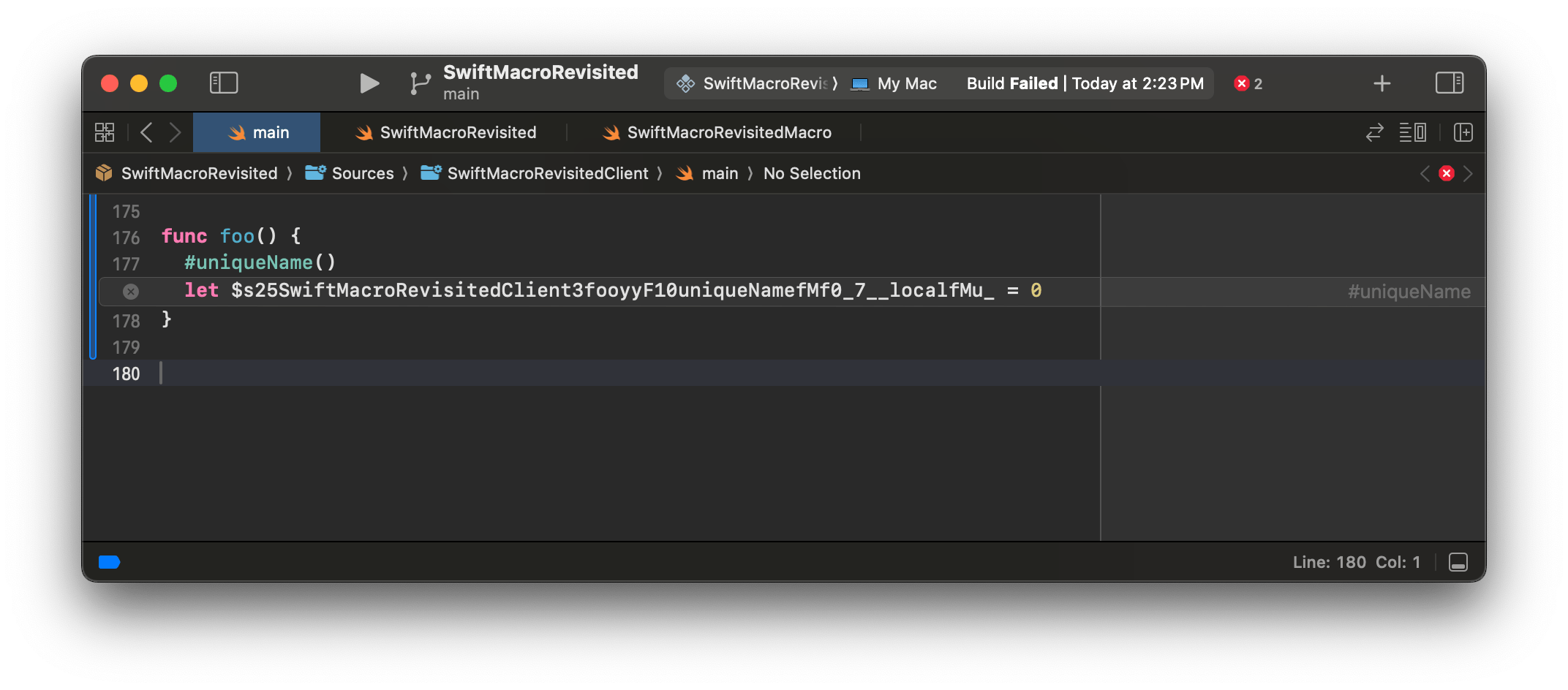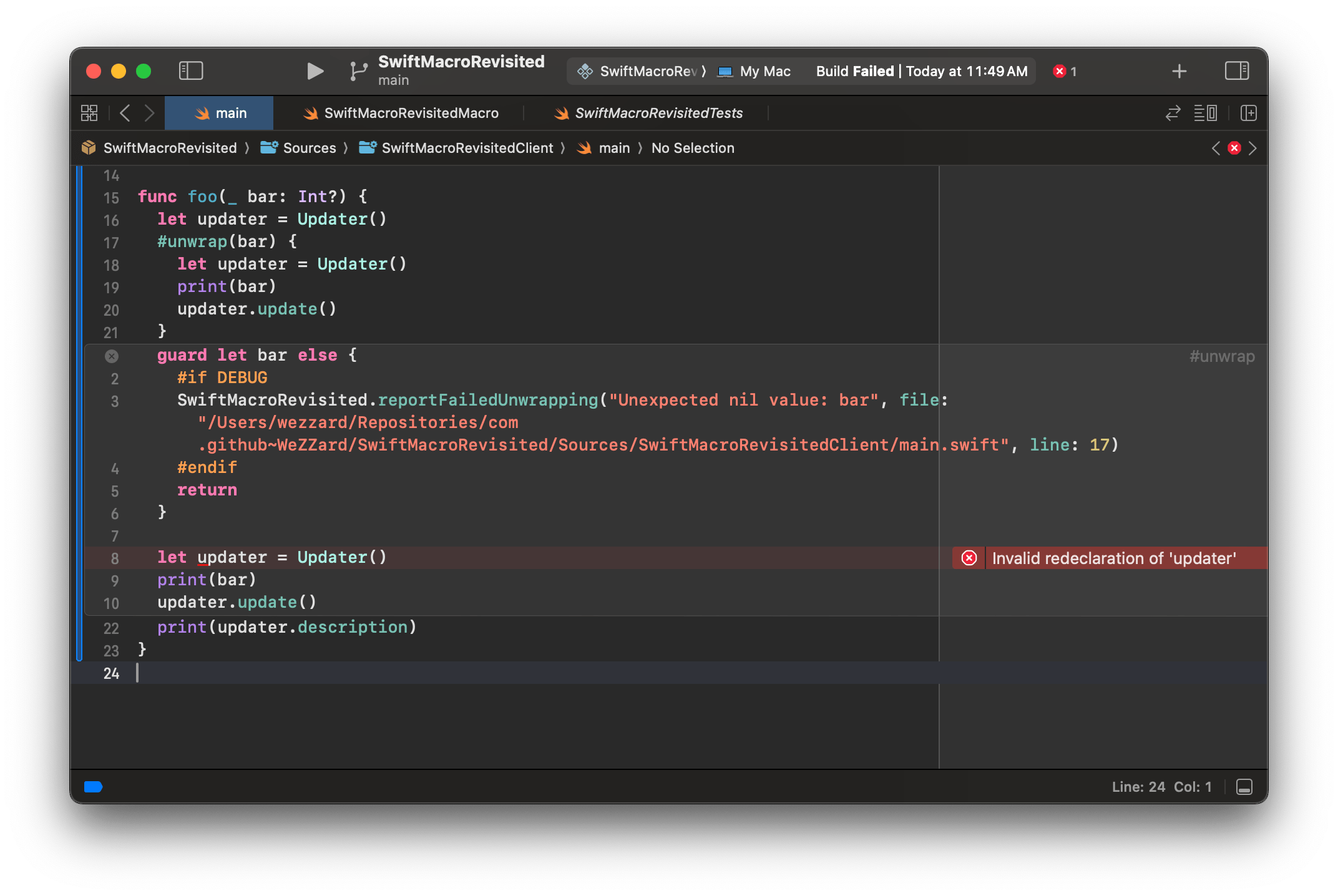swift1234567891011121314func foo(_ bar: Int?) { // `updater` 第一次被声明 let updater = Updater() // #unwrap 宏展开开始 guard let bar else { return } // `updater` 第二次被声明 let updater = Updater() print(bar) updater.update() // #unwrap 宏展开结束 print(updater.description)}