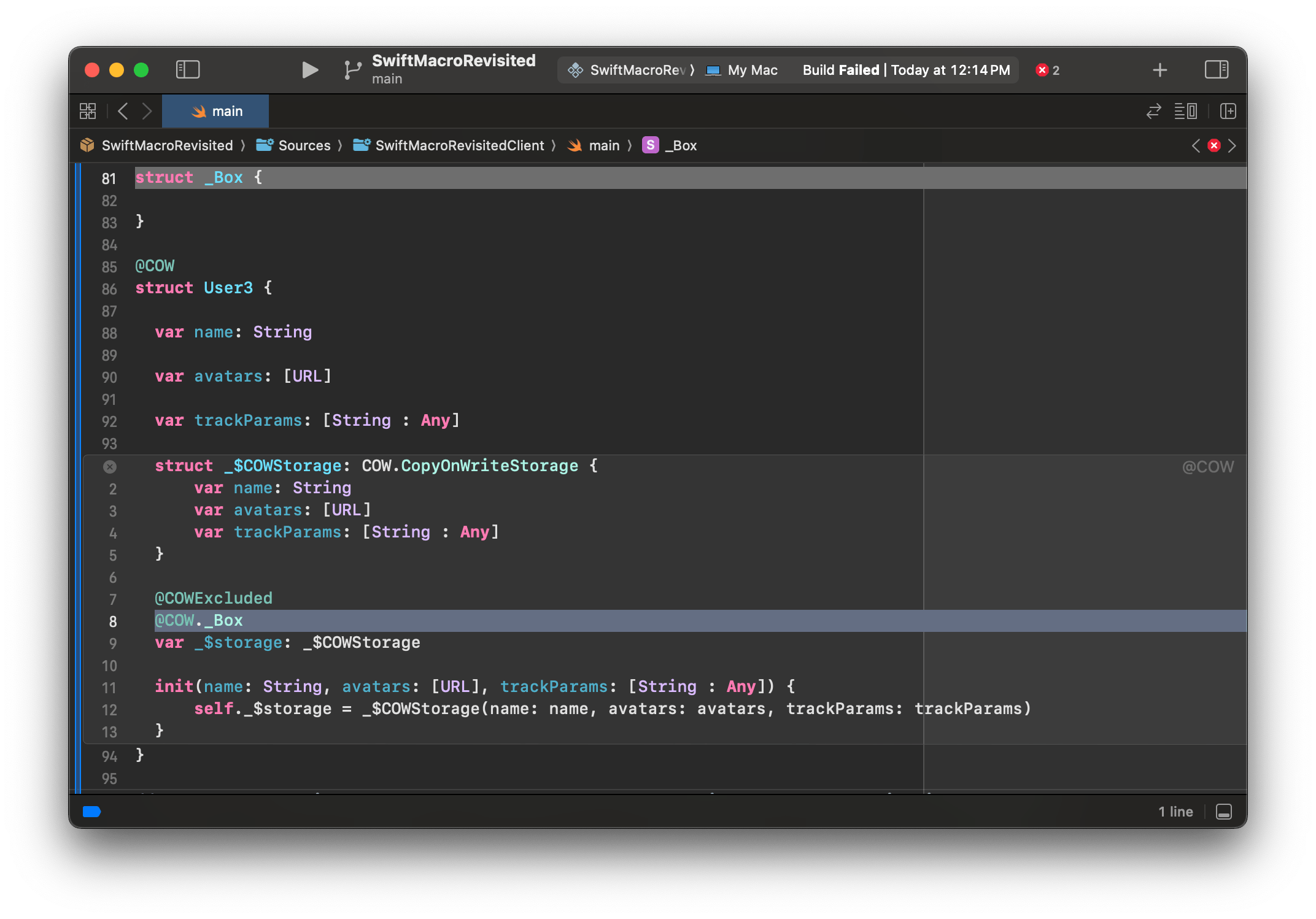 swift123456789101112131415161718192021222324252627@COW@DictionaryLikestruct User { @UseDictionaryStorage @COWIncluded var info: [String : Any]? { // @COWIncluded 宏展开开始 get { _$storage.info } set { makeStorageUniqueIfNeeded() _$storage.info = newValue } // @COWIncluded 宏展开结束 // @UseDictionaryStorage 宏展开开始 get { return _$storage["info"] as? [String : Any]? } set { _$storage["info"] = newValue } // @UseDictionaryStorage 宏展开结束 }}